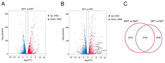 The analysis generated 4.5–6.8 million clean reads, with a Q30 value of more than 92% and a GC content of more than 53% (Table S3), indicating good quality of the RNA sequencing data. Statistical analysis showed that 5764 DEG, were produced in wild-type seedlings (marked as group SWT vs. NWT), of which 2762 genes were upregulated, respectively, and 3002 genes were down-regulated. On the other hand, the ospms1 mutant seedlings had 5000 DEGs (marked as group SP1 vs. NP1), of which 2334 were upregulated and 2666 genes were downregulated (Figure 5A,B). The Venn plot found 3192 genes shared among the SWT vs. NWT and the SP1 vs. NP1 groups (Figure 5C). These results indicated a change in the genes of ospms1 mutant seedlings at the transcription level under salt stress, which could alleviate the harm caused by salt stress.