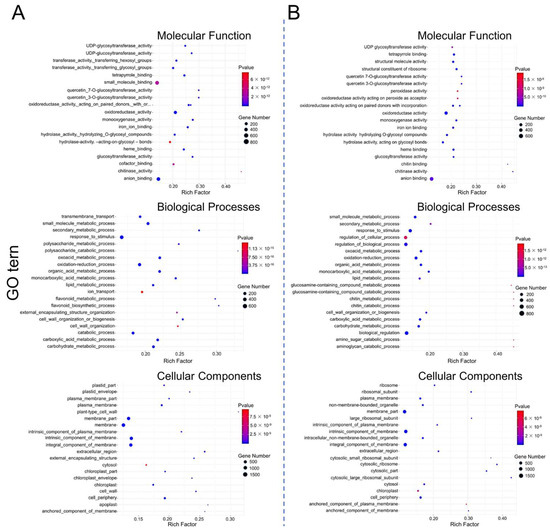 GO enrichment analysis of DEGs of WT (A) and ospms1-2 mutant (B) at 0 and 6 h of salt stress. The Y-axis of the bubble diagram represents GO enrichment terms in molecular functions, biological processes, and cellular components, and the X-axis represents the enrichment fraction. The larger the bubble, the greater the number of DEGs involved. The redder the color of the bow, the more significant the enrichment effect.