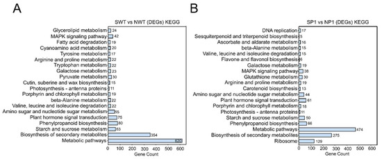 We performed KEGG metabolic pathway enrichment analysis to determine the metabolic pathway responsible for increased salt tolerance in ospms1 mutants. The DEGs obtained from the SWT vs. NWT group and the SP1 vs. NP1 group significantly enriched metabolic pathways and biosynthesis of secondary metabolites (Figure 7A,B). The DEGs of SP1 vs. NP1 and SWT vs. NWT groups enriched plant hormone signal transduction, MAPK signaling pathway, photosynthesis-antenna proteins, porphyrin, and chlorophyll metabolism pathways. In addition, a few DEGs in the SP1 vs. NP1 group specifically enriched ribosome, DNA replication, ascorbate and aldarate metabolism, flavone and flavonol biosynthesis, glutathione metabolism, and carotenoid anabolic pathways. These results suggest the significance of these pathways in salt stress response and tolerance mechanisms in the ospms1 mutants.