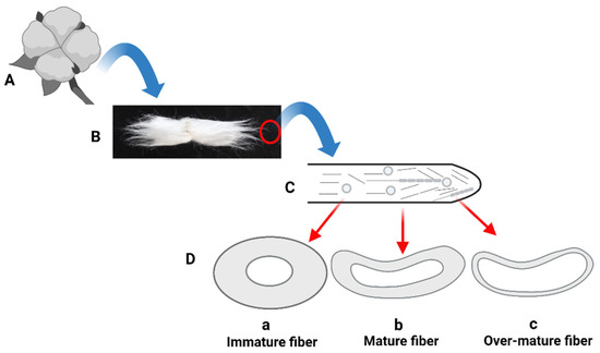 Cotton fiber is generally called an epidermal outgrowth of seed originating from an ovule [1]. Cotton is one of the most significant natural sources of textile-grade fiber, which, in its mature form, is made up of >90% cellulose [2,3]. The value of a cotton crop increases if the cotton fiber has better qualitative traits, such as whiteness, staple length, micronaire value, strength, and uniformity index [4].