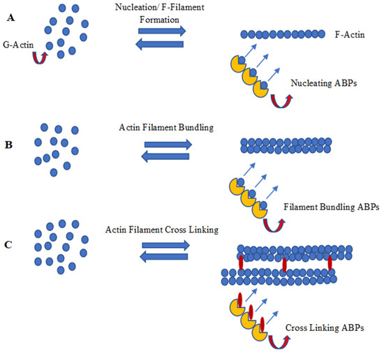 Actin is expressed in monomeric form, which is known as G-actin. The G-actin polymerises form a filament known as F-actin [58]. The formation of actin filaments by monomeric actin includes nucleation, polymerization/capping, and F-actin bundling and cross-linking activities. Many Actin-Binding Proteins (ABPs) are divided according to their association among G-Actin-binding/G-actin capping proteins and F-Actin regulators (ABPs), which are involved in either polymerization or depolymerization, and proteins that serve to crosslink and/or bundle the actin microfilaments [59]. The detailed pathway and the ABPs are involved in every step of actin microfilament formation.