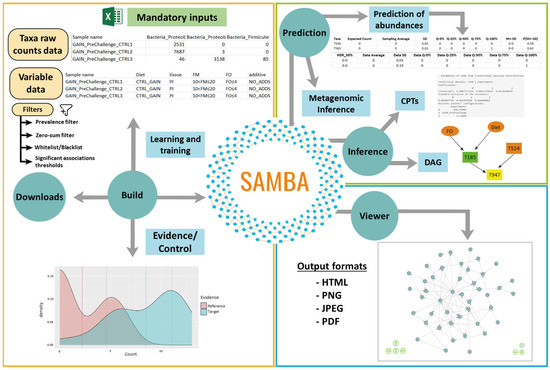 The source code of SAMBA as well as a dataset for testing the application are available at https://github.com/biotechvana/SAMBA (accessed on 23 June 2023). The two testing datasets (“Mock_community” and “S. aurata_dataset”) used to evaluate the performance and accuracy of SAMBA as well as the R.Data file with their respective BN models are available at the Web site of SAMBA with the following URL address https://github.com/biotechvana/SAMBA/tree/main/Testings_datasets (accessed on 23 June 2023). Each dataset includes two files containing the experimental variables (i.e., diet, tissue, additive, etc.), and the raw counts of all taxa per amplicon sample. This URL also includes another dataset named “metagenome_testing_dataset”, which is provided for users interested in training examples for metagenome predictions using the “Prediction” module of SAMBA. Original Fastq files from Mock community, the LSAQUA, EGGHYDRO, and GAIN_PRE trials are available at the SRA archive with the following bioproject accessions PRJNA891255; PRJNA713764; PRJNA705868; PRJNA750446.
