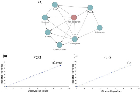 (A) Screenshot of the BN model created by SAMBA for the mock community showing how the distinct taxa are related to each other; (B) correlation analysis between the average predictions for the seven taxa relative to the normalized average values of abundances, in log scale, under PCR1 condition; (C) same correlation analysis but under PCR2 condition.