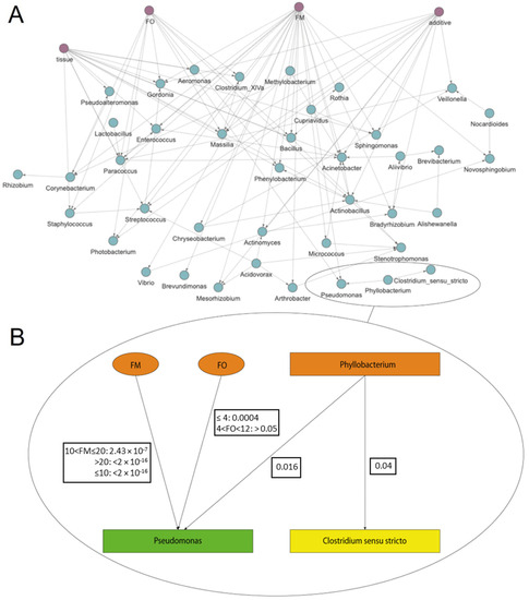 The second BN approach based on the S. aurata dataset was performed to assess how SAMBA builds and manages BN models using microbiome data from real-world experimentation (i.e., with high levels of dispersion in the taxa abundance counts). In Figure 3A, we show the DAG of the BN built using the S. aurata dataset. The prevalence filter of 50% reduced the number of taxa to 45. This number represents the core microbiome present in at least 36 of the 72 samples. This is a useful feature of SAMBA as it allows the user to focus not only on the whole dataset or the most abundant OTUs in the bacterial populations (the usual approach of 16S metagenomic analyses), but also on different subsets by managing the filtration parameters of the interface. Extracting functional and quantitative information from the DAG with SAMBA is easy and intuitive with the inference module. In particular, an example of how these results can be obtained is reported in Figure 3B, with the Markov blanket graph extracted from the total DAG. The image shows that the node representing Pseudomonas is the child of the nodes representing the experimental variables FO, FM and Phyllobacterium that indirectly connects Pseudomonas with Clostridium sensu stricto. The coefficient for conditional probability distribution that is significant for the node Pseudomonas, and the results of a Z test for each coefficient are shown in Supplementary File S3. According to this, it is possible to observe in Figure 3B that the FM variable (in its three states) has a significant impact on the abundance of Pseudomonas. In contrast, the variable FO only significantly impacts Pseudomonas when FO ≤ 4, but not when 4 < FO < 12. Additional to the dependences that occur between the experimental variables and taxa, the Markov blanket also offers information regarding the taxa–taxa interaction. The presence of Phyllobacterium in the pan-microbiome is significant in respect to Pseudomonas. This relationship means that the abundance of Phyllobacterium influences the abundance of Pseudomonas. Nevertheless, the impact of Phyllobacterium is less than that of FM and FO, which are the main causes for the variability in abundance of Pseudomonas in the S. aurata BN model. All these findings make SAMBA a useful tool, which allows the user to go one step forward in the comprehension of the inner dynamics of the microbial community. Regarding this, another example of functional information that can be obtained from the DAG is represented by the edges between OTUs and experimental variables. As the case of Pseudomonas, SAMBA detected other causal relationships, which connected other important genera like Streptococcus, Sphingomonas, Photobacterium, Massilia, Corynebacterium and Staphylococcus (Figure 3A) with components of the diet, such as FM, FO, and additives. The identification of which bacteria are more susceptible to changing in a diet and the magnitude by which they change their abundance, represents a cornerstone for nutrition in aquaculture. Defining the links that determine the pan-microbiome community structure when different feed conditions (as the case of the present experiments) or different environmental conditions are applied, provides a powerful forecasting tool to be used to face aquaculture challenges, such as the achievement of a more sustainable production sector through new innovative feed formulations.