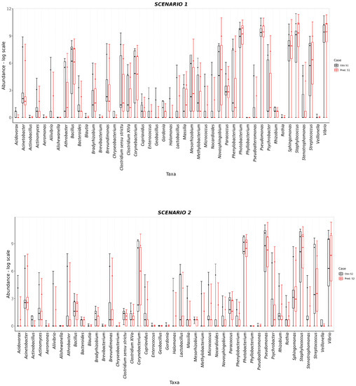 BoxPlot comparisons between predictions (red) and experimental observations (black) in log scale for Scenario 1 and Scenario 2. In both cases, the box plot for each taxon covers a range of values defined by the average abundance for that taxon and its standard deviations. The 25 and 75% quantiles as well as the median abundance values are represented as boxes.