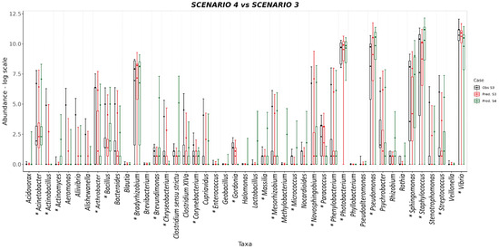 BoxPlot comparisons between predictions and experimental observations in log scale for Scenario 3 and Scenario 4 which is a prediction about how Scenario 3 would likely change when changing the FM conditions. Predictions for Scenario 3 are represented in red and observations black. Predictions for Scenario 4 are represented green. No observed data are provided for Scenario 4 because it is a virtual scenario that is derived from combining experimental condition FM of Scenario 1 with the experimental conditions for FO, TISSUE, and ADDITIVE of Scenario 3. As in Figure 4, each box plot includes information from the average abundance and standard deviations for each taxon plus the quantiles 25 and 75 and the median for the distribution of abundance counts. Taxa that are significantly influenced by variable FM are highlighted with an asterisk (see also Figure 3).