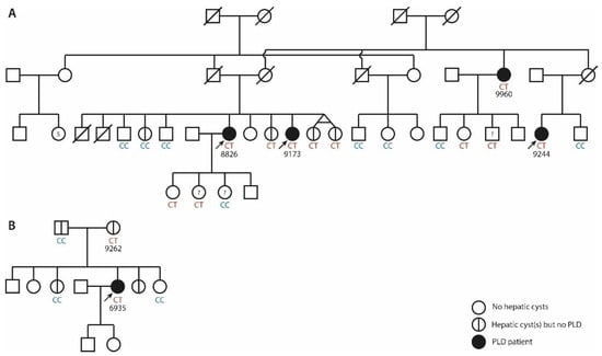 - Boerrigter, M.M.; Bongers, E.; Lugtenberg, D.; Nevens, F.; Drenth, J.P.H. Polycystic liver disease genes: Practical considerations for genetic testing. Eur. J. Med. Genet. 2021, 64, 104160. [Google Scholar] [CrossRef] [PubMed]
