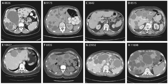 For 9 out of 16 patients, imaging was sufficient to determine abdominal wall hernias, a frequent extrahepatic manifestation in individuals with PLD [70]. Patients 9244 and 8515 had an umbilical hernia. The other seven patients did not have an abdominal wall hernia at the time of imaging (8826, 9173, 3642, 10027, 6935, 23932, and 11698).