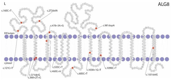 The eight novel variants, and the five previously reported variants [36,38], are positioned either at the N-terminal, in the middle, or at the C-terminal of the ALG8 protein (Figure 3L). They are located in the transmembrane regions, loops in the ER lumen, and loops in the cytosol region. Overall, the type of mutation or its location in the protein does not correlate with the clinical spectrum.
