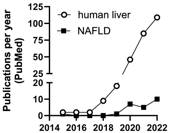 Number of publications per year including m6A and liver or NAFLD in PubMed.