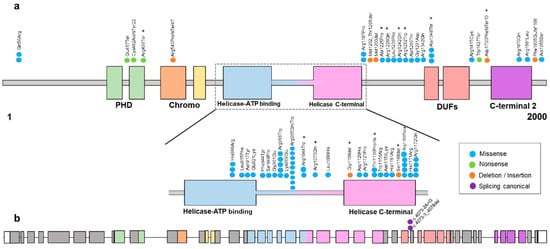 The majority of the detected variants were located within or between the helicase ATP-binding domain, the helicase C-terminal domain and the DUF domain except for the frameshift variant, which is located before the C-terminal 2 domain and the transcript encoded is predicted to be degraded by the nonsense-mediated decay (NMD) mechanism (Figure 1).