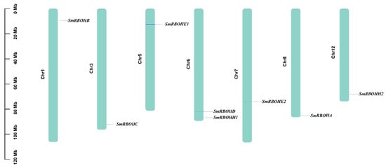 Chromosomal localization of the SmRBOH gene family members. Bars represent the length of each chromosome displayed in megabases (Mb) on the left side. The labeled positions indicate the locations of SmRBOH genes on the chromosomes.