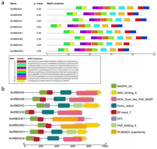 Motif and conserved domain analysis of SmRBOHs. The different lines represent protein lengths in amino acid (aa) units. (a) Distribution of 10 Motifs in SmRBOHs. Different colored rectangles represent distinct Motifs, with the annotations below the figure indicating the sequences of each Motif. (b) Distribution of conserved domains on SmRBOH proteins. Different colored blocks represent the presence of conserved domains on the SmRBOH proteins.
