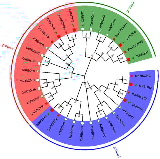 According to previous research, we obtained the protein sequences of SlRBOHs, AtRBOHs, and OsRBOHs in tomato, Arabidopsis, and rice [,]. Based on the SlRBOHs, AtRBOHs, and OsRBOHs protein sequences, combined with the identified SmRBOH proteins, a multiple sequence alignment was performed using the ClustalW method of MEGA 11 (detailed information in Tables S1 and S2), and we constructed a phylogenetic evolutionary tree using the Neighbor-Joining (NJ) method with the Bootstrap method set to 1000 replications. Additionally, we used Evolview (http://www.evolgenius.info/evolview/#/ accessed on 30 April 2023) to visualize the phylogenetic tree.