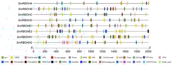 Positions of cis-acting elements on the SmRBOHs promoter sequences. The black lines represent the length of the SmRBOH promoters (in base pairs, bp), while the rectangles of different colors represent distinct cis-acting elements.