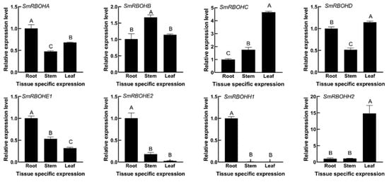 Expression patterns of SmRBOHs in roots, stems, and leaves. Based on a one-way analysis of variance and Tukey’s test (p < 0.01), the error bar represents the standard deviation, and different uppercase letters indicate highly significant differences in the relative expression levels of SmRBOHs among different tissues. The experiment was replicated four times, and SmActin was used as the internal reference gene.