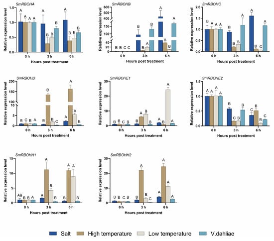 Expression patterns of SmRBOHs under salt, high-temperature, low-temperature, and V. dahliae inoculation conditions. Based on a one-way analysis of variance and Tukey’s test (p < 0.01), the error bar represents the standard deviation, and different capital letters indicate highly significant differences in relative expression levels of SmRBOHs at different treatment time points. The experiment was conducted with four replicates, and SmActin was used as the reference gene.