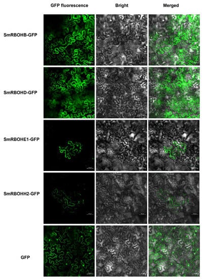 Expression of SmRBOHs-GFP fusion proteins in N. benthamiana leaves. The SmRBOHs-GFP fusion expression vector was transiently expressed in N. benthamiana leaves for 48 h, and the expression was observed using laser scanning confocal microscopy. Scale bar = 50 μm.