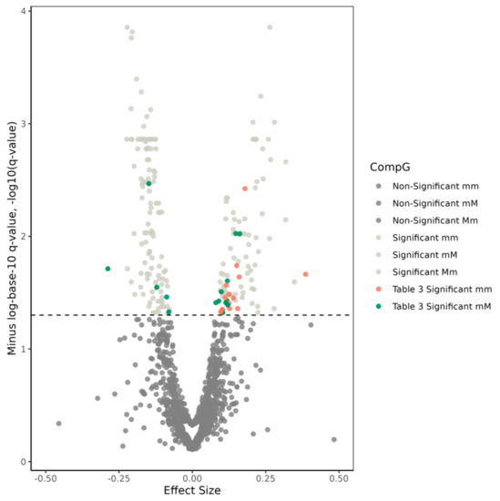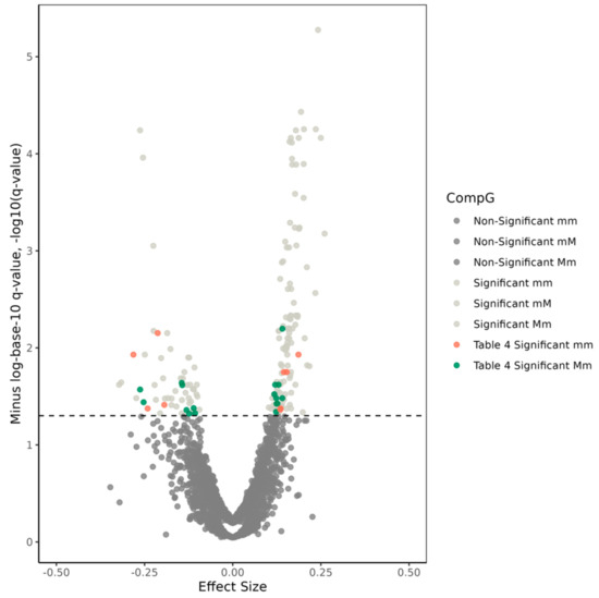 Volcano plot for compound genotype (CompG) analyses of the 1225 single-nucleotide polymorphism (SNP) pairs selected within the ABCA7 gene region. The x-axis displays effect sizes of CompGs, while the y-axis shows minus-logarithm-base-10-transformed q-values, representing false-discovery rate (FDR) adjusted significance. The dashed line indicates the significance threshold, set at −log10 (q-value = 0.05) = 1.3. Dark-gray dots below the cutoff line represent non-significant effects for Mm, mM, and mm CompGs. Light-gray dots above the cutoff line indicate significant SNP pairs whose comprising SNPs were associated with Alzheimer’s disease (AD) individually. Red and green dots above the cutoff line denote SNP pairs whose comprising SNPs were not associated with AD individually and were presented in Table 4 and Table S5.