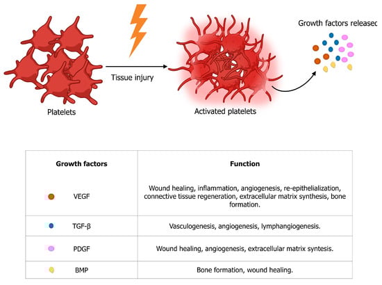 New strategies in regenerative medicine aim to better understand and exploit the potential of endogenous stem cells and autologous growth factors, which are specialized polypeptide molecules that bind receptors on target cells and deliver messages regarding migration, proliferation, differentiation, survival, and cell secretion [14]. The classes of growth factors most involved in tissue regeneration are considered below, including transforming growth factor beta (TGF-β), bone morphogenetic proteins (BMPs), vascular endothelial growth factor (VEGF), and platelet-derived growth factor (PDGF). The reported growth factors are all produced mainly by platelet activation following tissue injury (Figure 1) [15].