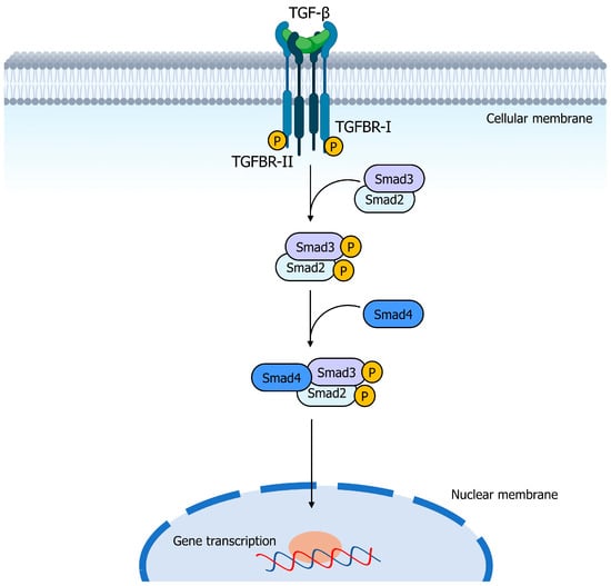 Members of the TGF-β family are secreted by platelets, endothelial cells, lymphocytes, and macrophages. They act by binding as dimers to surface receptors with serine/threonine kinase activity (Figure 2). Upon binding, two type II receptors (TGFBR-II) and two type I receptors (TGFBR-I) form a stable complex in which the TGFBR-II receptors phosphorylate and activate the TGFBR-I receptors. The activated TGFBR-I receptors then phosphorylate the cytoplasmic transcription factors Smad2 and Smad3, which form a trimer with Smad4. The resulting complex translocates to the nucleus and regulates the expression of target genes [17,18,19].