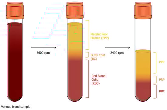The first generation of platelet concentrates is called platelet-rich plasma (PRP), and its discovery dates back to 1970. PRP is derived from the patient’s whole blood and is obtained by a two-stage centrifugation process: separation and concentration (Figure 6). For the separation phase, four aliquots of 8 mL of whole blood are collected in a sterile tube containing a citrate–phosphate–dextrose anticoagulant solution centrifuged at 5600 rpm [31,32]. This results in a separation into three layers:
