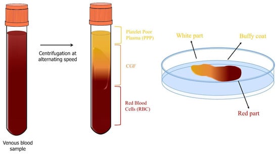 The third and final generation of platelet derivatives is called concentrated growth factors (CGFs) and can also be considered a modified form of PRF that was developed by Sacco in 2006. CGFs are obtained by centrifuging the blood sample (8 mL) at alternating speeds for 13 min (2 min at 2700 rpm, 4 min at 2400 rpm, 4 min at 2700 rpm, and 3 min at 3000 rpm) using a specific centrifuge, the Medifuge MF200 (Silfradent srl, Italy) (Figure 8). At the end of this procedure, three different layers can be observed in the sample [45]: the upper layer of plasma, PPP, the middle layer containing fibrin and growth factors, CGFs, and the lower layer of RBC. The middle layer, called the CGF, can be further subdivided into the upper white part, the lower red part, and the intermediate BC [46].