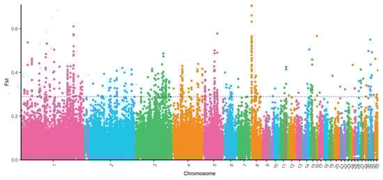 The F-statistic reflects a change in the population structure, which is affected by different factors such as mutation, genetic drift, inbreeding, and selection or the Wahlund effect. According to the conditions of neutral evolution, the size of the F-statistic is mainly determined by influencing factors such as genetic drift and migration. If an allele in a population undergoes adaptive selection because of its high fitness in a specific habitat, then its frequency increases in the population. Subsequently, the level of population differentiation increases, which is reflected in the F-statistic (where 0 ≤ Fst ≤ 1). As the Fst was approximately 1, the differences between the subpopulation were greater. Figure 1 shows the distribution of the Fst in the genome of the Tibetan black chicken.