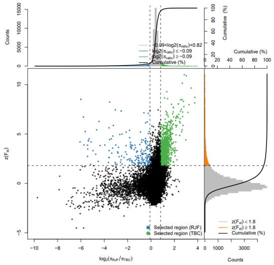 Fst and θπ combined in the screen selected regions. The abscissa is the ratio of θπ (red jungle chicken/Tibetan black chicken) and the ordinate is ZFst (Fst is standardized and converted to ZFst), which correspond to the frequency distribution diagram above and the frequency distribution diagram on the right, respectively. The dot diagram in the middle represents the corresponding ZFst and θπ ratios in different windows. The top blue and green areas are the top 5% area selected by θπ, and the orange area is the top 5% area selected by ZFst.