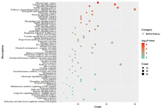 The 732 candidate genes screened in the subject selection method were selected for KEGG pathway (Figure 3 and Supplementary Table S1) and GO enrichment analyses (Figure 4). The results obtained from the KEGG pathway analysis showed significant biological pathways such as calcium signaling pathways, circadian regulation, the MAPK signaling pathway, the GnRH signaling pathway, neurodegenerative pathway multiple diseases, the oxytocin signaling pathway, salivary secretion, the phospholipase D signaling pathway, gastric acid secretion, vascular smooth muscle contraction, progesterone-mediated oocyte maturation, oocyte meiosis, melanogenesis, thyroid hormone synthesis and growth hormone synthesis. However, the GO enrichment analysis was mainly concentrated in synaptic signaling, post synapse, dendrite, glutamatergic synapse, regulation of growth, positive regulation of organelle organization, cellular response to organonitrogen compound, regulation of cellular catabolic process, the MAPK signaling pathway, regulation of ion transport, cation channel complexes, Golgi membranes, ATP hydrolysis activity, pathways of neurodegeneration—multiple diseases, the actin cytoskeleton, regulation of anatomical structure size, second-messenger-mediated signaling, cell junction organization, cellular component morphogenesis and the proteasome-mediated ubiquitin-dependent protein catabolic process.