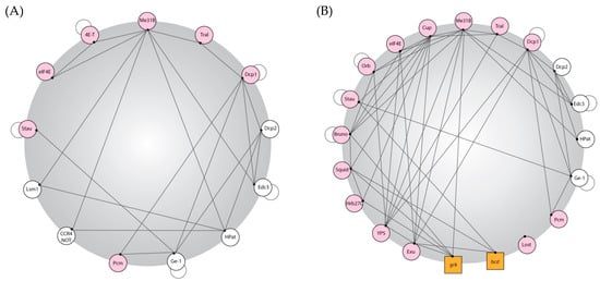 Drosophila P body protein interactions. P body proteins in Drosophila have dense interaction networks coupled with the ability to bind RNA. Created using publicly available data on BioGRID and based on interaction maps produced for yeast and human P body proteomes [20]. (A,B) An interaction map of Drosophila P body proteins. Proteins are represented in circles and RNA is represented in squares; a line shows potential protein–protein or protein–RNA interactions (these interactions were elucidated using biochemistry; thus, the spatial information, whether this interaction is P-body-specific, is lost, so these diagrams represent maximal/potential interactions that could be taking place in a P body); a pink circle shows that the protein can bind RNA; and an adjoining circle denotes that the protein can self-bind. (A) Interactions between canonical P-body components in Drosophila; (B) interactions between P body components found in Drosophila egg chambers. To consider all possible factors, minimal stringency was applied to the existing data in the field.