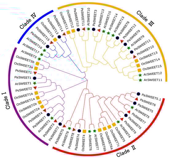 Phylogenetic analysis of SWEET proteins from Prunus salicina, Prunus avium, Oryza sativa, and Arabidopsis thaliana. The SWEETs from P. salicina, P. avium, O. sativa, and A. thaliana were marked with a red triangle, purple circle, yellow square, and green star, respectively. The phylogenetic tree of the SWEET family protein sequences was conducted using MEGA 6.0 via the neighbor-joining method with 1000 bootstrap replicates. The gene family was divided into four SWEET subfamilies, clade I, II, III, and IV.