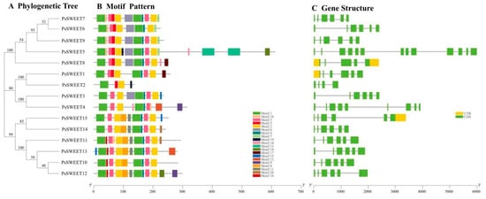 Phylogeny, motifs, and exon–intron structures of PsSWEET proteins or genes. (A) Neighbor-joining phylogenetic tree of PsSWEETs. (B) Distribution of the conserved motifs in PsSWEET proteins. Twenty conserved motifs are marked with different colored boxes. (C) Exon-intron structure of PsSWEETs genes. Green boxes indicate exons, yellow boxes indicate UTR, and black lines indicate introns, respectively.