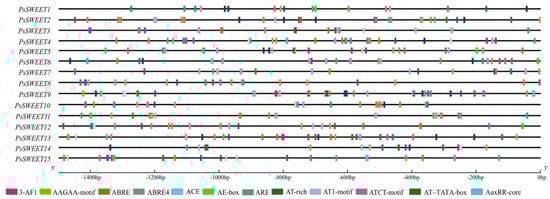 To enhance the comprehension of PsSWEETs’ transcriptional regulation and potential functions, 5′ regulatory elements in the 1500 bp sequences located upstream of their translation start sites were analyzed using the PlantCARE server. Twelve different types of putative cis-elements responsive to biotic stresses, fruit development, and hormones, including 3-AF1, AAGAA-motif, ABRE, AE-box, ARE, AT-rich, AT1-motif, AT~TATA-box, AuxRR-core, were found in the 1500 bp promoters of PsSWEET genes (Figure 3).