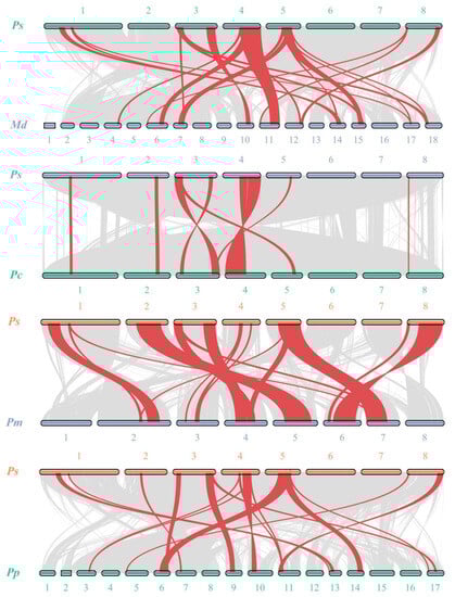 To explore the potential evolutionary clues of the PsSWEET gene family, a series of comparative syntenic maps of P. avium associated with the four Rosaceae plant species, including Malus domestica, Prunus persica, Pyrus communis and Prunus mume, were constructed in this study. The syntenic analysis of PsSWEET family members exhibited that 15 PsSWEET genes were in synteny with M. domestica (8), P. persica (10), P. communis (8), and P. mume (10) (Figure 5).