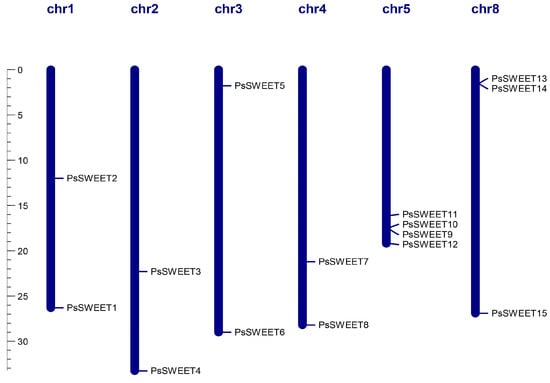 Schematic representations of the chromosomal location of the PsSWEET genes. The chromosome number is marked on each chromosome.