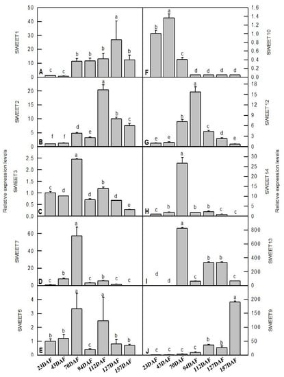 qRT-PCR analysis of key PsSWEETs during fruit development and ripening of ‘Furongli’ plum. (A) SWEET1; (B) SWEET2; (C) SWEET3; (D) SWEET7; (E) SWEET5; (F) SWEET10; (G) SWEET12; (H) SWEET14; (I) SWEET13; (J) SWEET9. Data are the means ± SD of three biological replications (n = 3). Different letters above the bars indicate a significant difference at p < 0.05.