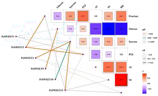 The correlations among the expression levels of the six key PsSWEET genes and soluble sugar contents (sucrose, fructose, and glucose), and related enzyme activity (PGI, HK, and AI). Data of soluble sugar contents and enzyme activities used for the correlation analysis were extracted from our previous reported literature [39]. The lines correspond to the expression correlations between the six key PsSWEET genes and the soluble sugar contents, and related enzyme activity. The colors of the lines represent the Mantel’s pd, and the thicknesses of the lines represent the percentage of the Mantel’s rd. The intensity of the color from blue to red and size of the box indicate the degree of the expression correlation among the soluble sugar metabolic. “*”, “**”, and “***” mean a significant difference at p < 0.05, 0.01, and 0.001, respectively.