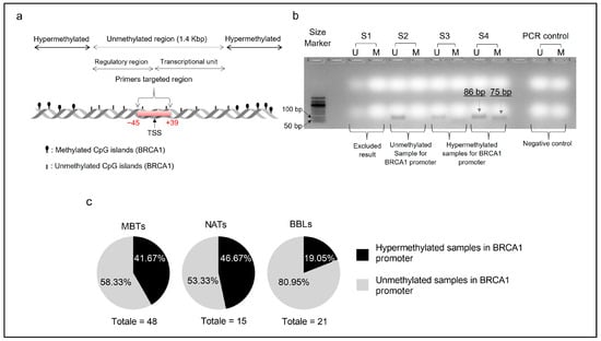 In this study, we examined the BRCA1 promoter hypermethylation status in 84 human breast tissues (48 MBTs, 15 NATs, and 21 BBLs) using methylation-specific PCR. According to Esteller et al. [], the sense of primers U binds to the 1536 bp position of the Gen-Bank sequence “U37574”, while the sense of primers M binds to the 1543 bp position of the same sequence [] (Figure 1a). The BRCA1 regulatory region is included in a large unmethylated sequence of 1.4 kilobase pairs (Kbp) flanked by two hypermethylated regions []. This regulatory region is selectively maintained in normal cells unmethylated to ensure BRCA1 gene expression []. The targeted region of the BRCA1 promoter is located approximately between positions −45 (1536 bp in “U37574”, sequence) and +39 (1619 bp in “U37574”, sequence), comprising the transcriptional start site, TSS (Figure 1a). The validation of primers was conducted in the MCF-7 cell line as a human breast cancer model of Luminal A subtype‘ER+, BRCA1wt ’ []. Divers studies reported negative [,] or partial methylation of BRCA1in these cells [,], and our exploration reinforces the partial methylation of BRCA1 in MCF-7 cells (Figure S1). Interestingly, we observed a stable BRCA1 promoter methylation profile throughout the proliferation period of breast cancer MCF7 cells (4 days) (Figure S1). Our result highlights the stability of this epigenetic silencing in breast cancer cells independently of both the confluence state of cells and secreted cytokines in the extracellular medium over 4 days.
