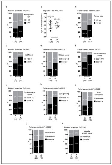 Association between BRCA1 promoter methylation and various clinical and histopathological characteristics of malignant breast tumors (n = 48): (a) menopausal age (≤47: premenopausal age; >47: postmenopausal age), (b) age at primary diagnosis, (c) tumor size, (d) Ki67 level, (e) mitosis score, (f) tubule formation score, (g) nuclear grade score, (h) SBR grading, (i) in situ component, (j) nodal status, (k) vascular emboli status. The letter “U” in each graph represents the group of BRCA1 unmethylated samples, while the letter “M” represents the group of BRCA1 hypermethylated samples. The missing data for each feature are presented in Table S2. The statistical significance was determined by GraphPad 8. SD: Standard Deviation; SRB: Scarff–Bloom–Richardson.