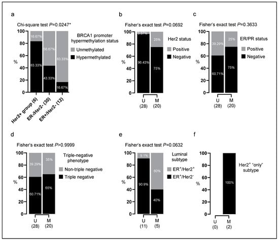 Association of BRCA1 promoter hypermethylation with Her2 overexpression and aggressive molecular subtypes of breast cancer: (a) molecular subtypes of breast cancer, (b) Her2 status, (c) ER/PR status, (d) triple-negative phenotype, (e) luminal subtype, (f) Her2+ “only” subtype. The letter “U” in each graph represents the group of BRCA1 unmethylated samples, while the letter “M” represents the group of BRCA1 hypermethylated samples. The missing data for each feature are presented in Table S2. The statistical significance was determined by GraphPad 8. * Statistical significance is affirmed by a p-value under 0.05. ER: Estrogen Receptor; PR: Progesterone Receptor; Her2: Human epidermal growth factor receptor 2.