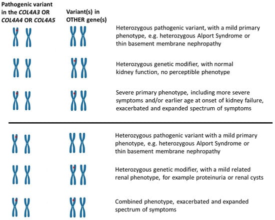 To account for this extensive clinical heterogeneity, several authors have invoked the concept of genetic modifiers (GM). What is a genetic modifier? It may not be possible to agree on a universal definition. Some may consider that GMs operate as additional (one or more) molecular defects, which determine the final phenotype on the background of the primary COL4A pathogenic variant. In this sense, one could argue that the phenotype is the consequence of digenic inheritance in the sense that it “can be better explained” by invoking the contribution of two variants at different loci, genetically linked or unlinked, than each one on its own. A variation to this definition was offered by Deltas (2018): […a GM is a DNA variant that exerts an epistatic effect on the phenotype, which is invariably determined by a primary gene. The variable expressivity (clinical or phenotypic heterogeneity) may be confounded by the contribution of one or more GM. This phenotypic heterogeneity, which can be hugely variable, ranging from very benign to very severe and life threatening, is part of the spectrum of symptoms which pertain to the genotype/phenotype correlation focusing on the primary gene at fault] [].