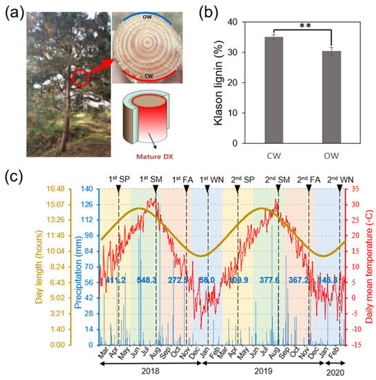 Samples were collected from 14-year-old Korean red pine (P. densiflora) grown in the Korea Forest Research Institute (KFRI, Suwon, Republic of Korea, 37°15′ N, 126°57′ E), between 2018 and 2020 (approximately 9.5 m in height and 15.5 cm in diameter at breast (DBH)). In branches of P. densiflora, the lower side with high lignin was classified as CW and the upper side as OW. Developing xylem (DX) of CW and OW was collected during four seasons: spring (SP), summer (SM), fall (FA), and winter (WN) in the indicated time by scraping the surface of debarked branches, respectively (Figure 1a, Supplementary Table S1). Each sample was collected from a branch at DBH of the tree to ensure the same developmental stage. Details about temperature, day length, and precipitation during the sampling period can be found in Figure 1c, with information sourced from the Korea Astronomy and Space Science Institute (KASI; “https://astro.kasi.re.kr (accessed on 20 August 2023)”) and the Korea Meteorological Administration (KMA; “https://www.weather.go.kr (accessed on 20 August 2023)”). The temperature and day length on sampling day were presented in Supplementary Table S1.