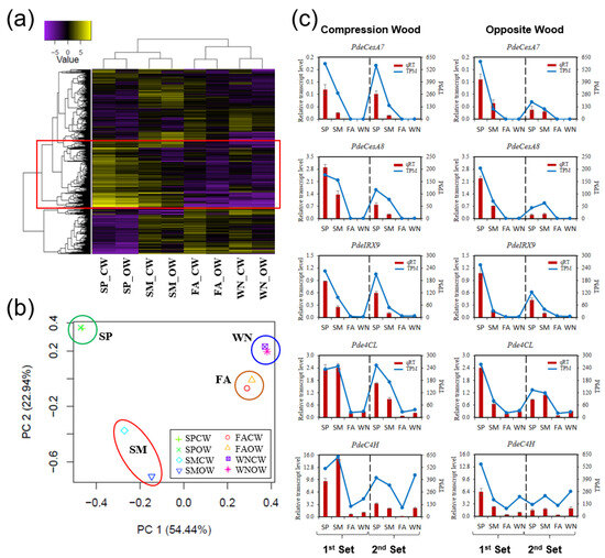 Seasonal wood tissue-specific transcriptome analysis of P. densiflora. (a) Sample correlations are illustrated using a heat map. SP, spring; SM, summer; FA, fall; WN, winter. CW, compression wood; and OW, opposite wood. Average values of two-set biological replicates (log2 fold change value with p-value, 0.005) were used in the Trinity package (analyze_diff_expr.pl). Clusters up-regulated in SP-SM are marked in red box. (b) Principal component analysis (PCA) plot was generated using the same dataset described in (a) in iDEP.91 (http://bioinformatics.sdstate.edu/idep/ (accessed on 20 August 2023)) with default parameters. (c) Validation of the RNA-seq data by marker genes of secondary cell wall formation. In each plot, blue line (right Y-axis) represents TPM (Transcript Per Million) values of the indicated gene from RNA-seq data while red bars (left Y-axis) show the results of independent qRT-PCR experiments. Error bars indicate SD (n = 3).