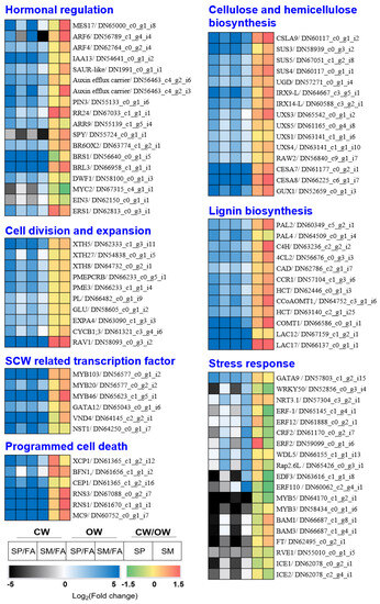 Most wood formation-related genes (e.g., cell division and expansion, SCW-related transcriptional factors, SCW biosynthesis, and PCD) were significantly upregulated in spring, with many stress response genes downregulated in CW during both spring and summer. Certain genes were found to have a higher expression in summer (e.g., WRKY50, NRT3.1, ERF-1, etc.) (Figure 3, Supplementary Table S3). The CW/OW fold change was similar in SP in most of the wood formation genes, whereas some genes were higher in SM (e.g., MES17, ARF6, Auxin efflux carrier, MYB46, CSLA09, UXS3, CESA8, PAL2, etc.) (Figure 3, Supplementary Table S3).