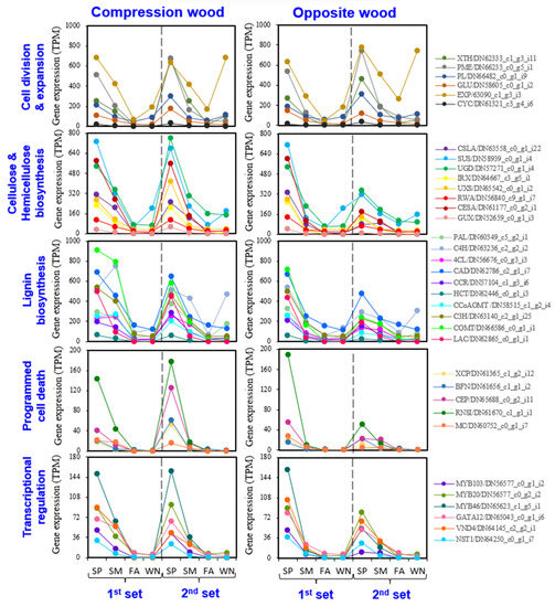 To evaluate the quality of the tissue samples before performing RNA-seq for transcriptome analysis, we tested several marker genes related to wood formation using semi-quantitative RT-PCR (Figure S1). PdeNAC2 and PdeMYB46, close homologues of Arabidopsis MYB46 and VND6, respectively, were highly expressed during growing season (SP and SM) in both CW and OW and minimally expressed or not at all during the dormant season (FA and WN) (Figure S1). Similarly, SCW-specific cellulose synthases (i.e., PdeCesA7 and PdeCesA8), lignin monomer biosynthetic genes (Pde4CL, PdeC3H, PdeCOMT, PdeCCoAOMT1, PdeCCR) and lignin polymerization genes (PdeLAC3, PdeLAC10, PdeLAC12) were predominantly expressed in SP and SM in both CW and OW (Figure S1). Some lignin monomer biosynthesis genes (e.g., PdeC4H and PdeCAD) were also expressed in FA and WN, suggesting their roles in defense mechanisms [14]. Interestingly, PdeLAC17 was exclusively expressed in CW, not OW, during the growing season.