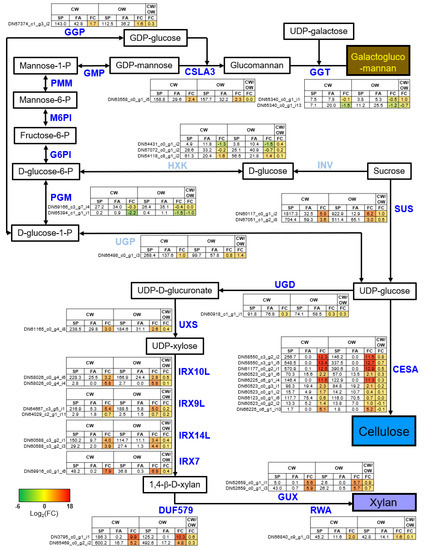 Interestingly, genes such as INV, HXK, PGM, and UGP involved in the initial metabolism of sucrose did not significantly increase their expression in spring compared to fall (Figure 5). Only GGP and CSLA3, responsible for glucomannan production, were upregulated in spring, suggesting seasonal regulation might not significantly impact galactoglucomannan biosynthesis. For cellulose and xylan biosynthesis, all pathway genes were more active in spring than fall, particularly the CESA genes (Figure 5). There were no noticeable differences between CW and OW formation (Figure 5).