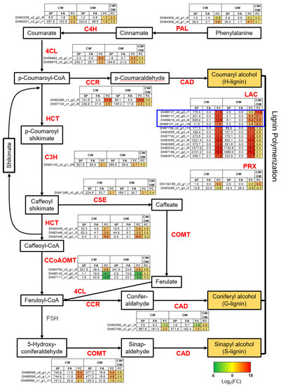 We aimed to identify key genes involved in the SCW biosynthesis that are critical for CW formation as a response to seasonal changes. For this, we reconstructed the biosynthesis pathways of SCW components (cellulose, galactoglucomannan, xylan, and lignin) using previously reported genes in P. densiflora [4] (Figure 5 and Figure 6). With sucrose or phenylalanine as a starting molecule, cellulose/galactoglucomannan/xylan and lignin biosynthetic pathways are shown in Figure 5 and Figure 6, respectively. The enzymes involved in each step of the biosynthetic pathway are encoded by multiple genes, but genes (i.e., contigs) with significant expressions were shown (Figure 5 and Figure 6).