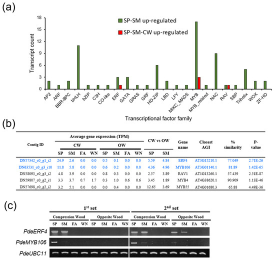 Subsequently, we sought to identify transcription factors (TFs) upregulated during CW formation (Figure 8, Supplementary Table S5). Among the many TF families found to be upregulated from spring to summer, we identified TFs significantly upregulated in CW in both spring and summer (PdeERF4 and PdeMYB106) (Figure 8a,b). Their expression patterns were confirmed by semi-quantitative RT-PCR (Figure 8c).