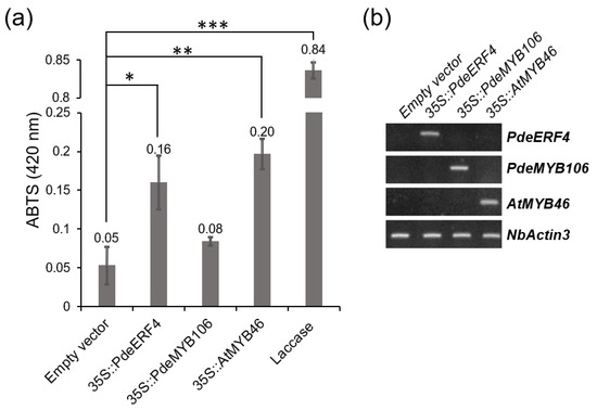 For the preliminary characterization of PdeERF4 and PdeMYB106 functions, we transiently introduced 35S::PdeERF4 or 35S::PdeMYB106 constructs into tobacco leaves and assessed the oxidative activity after 4 days of infiltration (Figure 9). 35S::AtMYB46, a known TF regulating AtLAC17 [5], was used as a positive control and showed a substantial increase in ABTS absorbance (Figure 9a). 35S::PdeERF4 significantly boosted oxidation, whereas 35S::PdeMYB106 showed no significant effect (Figure 9a). The expressions of the introduced transgenes were confirmed by semi-quantitative RT-PCR (Figure 9b). These findings suggest that PdeERF4 might positively influence the activity of laccases.
